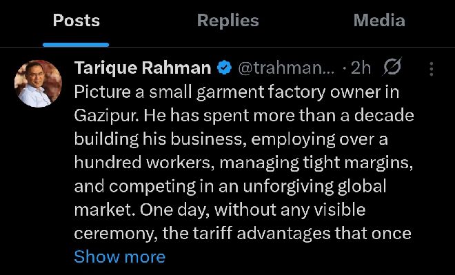 তিনি লিখেন, গাজীপুরের একজন ক্ষুদ্র গার্মেন্টস কারখানা মালিককে কল্পনা করুন। এক দশকেরও বেশি সময় ধরে তিনি নিজের হাতে ব্যবসা গড়ে তুলেছেন। শতাধিক শ্রমিককে কর্মসংস্থান দিয়েছেন, পাতলা মার্জিনে ব্যবসা চালিয়েছেন, বৈশ্বিক বাজারে কঠিন প্রতিযোগিতার মুখে টিকে আছেন।