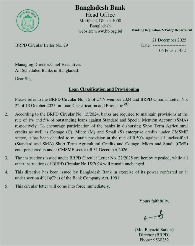 বাংলাদেশ ব্যাংকের ব্যাংকিং রেগুলেশন অ্যান্ড পলিসি ডিপার্টমেন্ট (বিআরপিডি) থেকে রোববার (২১ ডিসেম্বর) জারি করা সার্কুলার লেটার নং–২৯ অনুযায়ী, দেশের সব তফসিলি ব্যাংককে এই নতুন প্রভিশনিং হার অনুসরণ করতে বলা হয়েছে। সার্কুলারটি তাৎক্ষণিকভাবে কার্যকর হয়েছে এবং এটি ৩১ ডিসেম্বর ২০২৬ পর্যন্ত বলবৎ থাকবে।