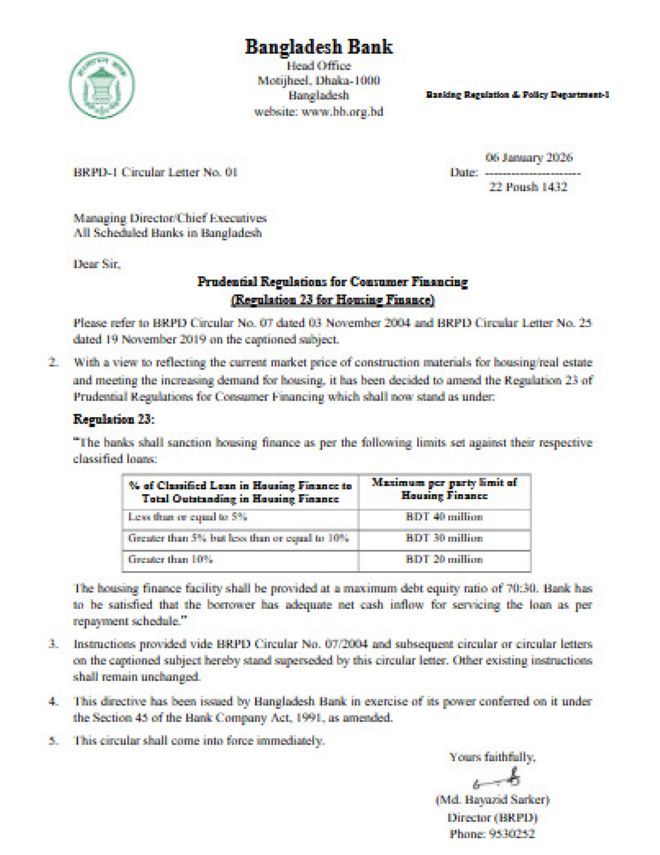 বাংলাদেশ ব্যাংক জানায়, নতুন নীতিমালার মাধ্যমে গৃহনির্মাণ খাতে ঋণপ্রাপ্তি আরও সুষ্ঠু ও বাস্তবসম্মত হবে এবং বাজারে ফ্ল্যাট ক্রয় প্রক্রিয়া আরও গতিশীল হবে।