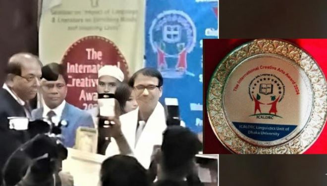 বিশিষ্ট উন্নয়ন কর্মী ও গবেষক ডা. মো. তাসকিনুর রহমানকে ‘ইন্টারন্যাশনাল ক্রিয়েটিভ আর্টস অ্যাওয়ার্ড ২০২৫’, Certificate of Honor এবং Fellowship গ্রহন করছেন। ছবি: সংগৃহিত
